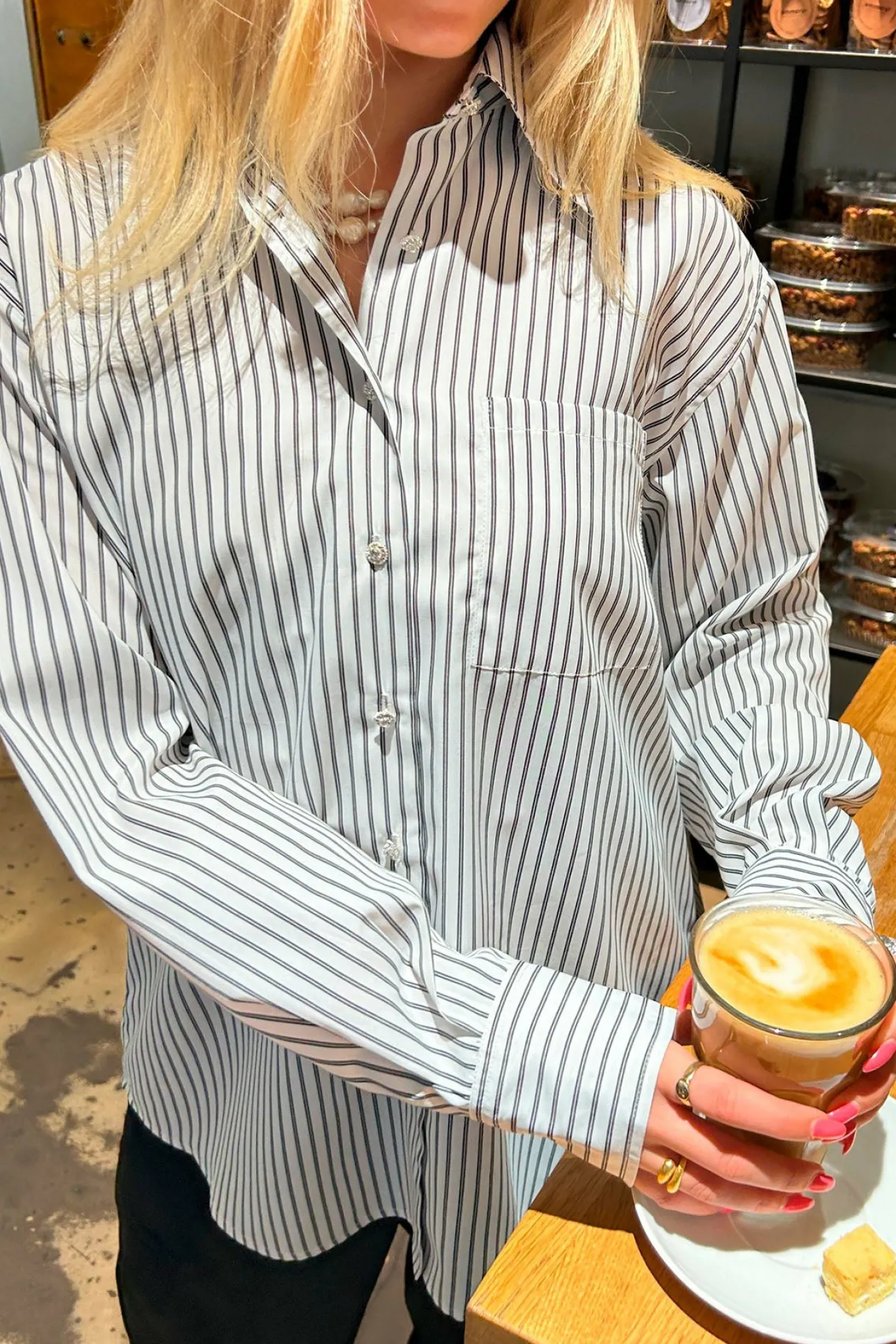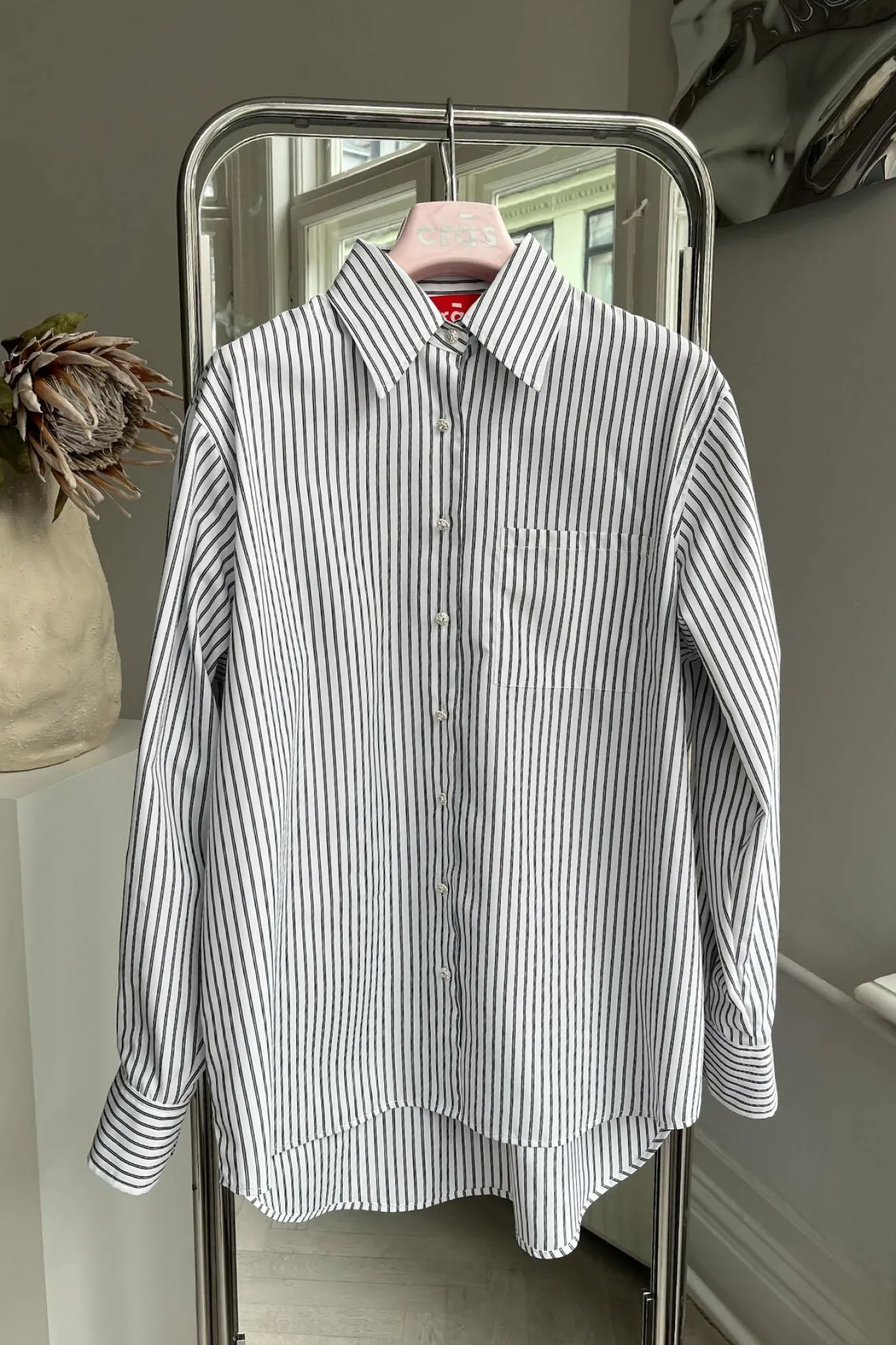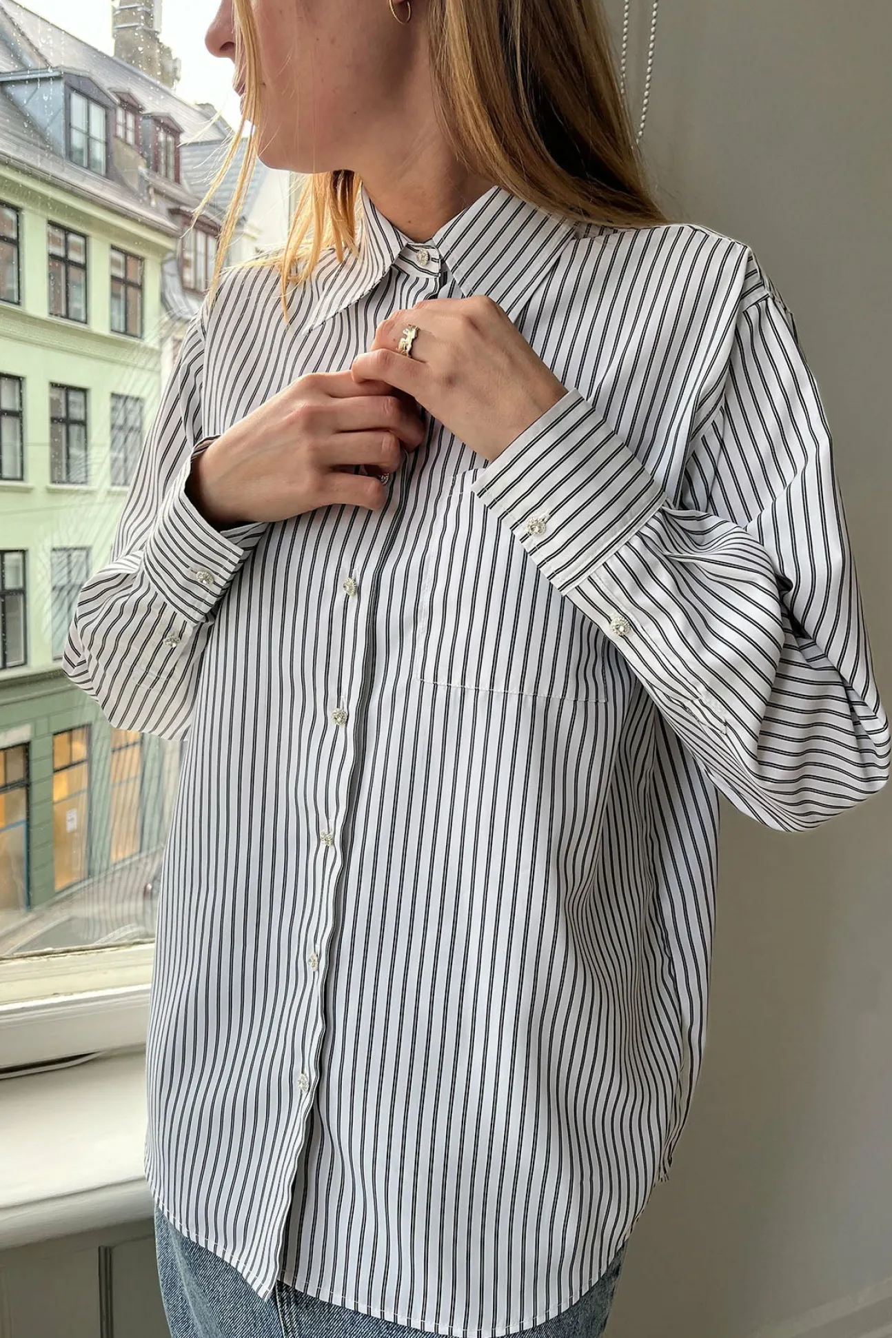 Cool, Stribet Skjorte Med Rhinstensknapper Og Brystlomme. Den Lettere Overdimensionerede Pasform Tilføjer En Moderne Kant, Hvilket Sikrer Både Komfort Og Alsidighed. Style Den Sammen Med Dine Yndlingsjeans For Et Afslappet Look, Eller Dress Den Op Med Skræddersyede Bukser For Et Mere Raffineret Og Poleret Look. Fremstillet Af 100% Genanvendt Polyester.