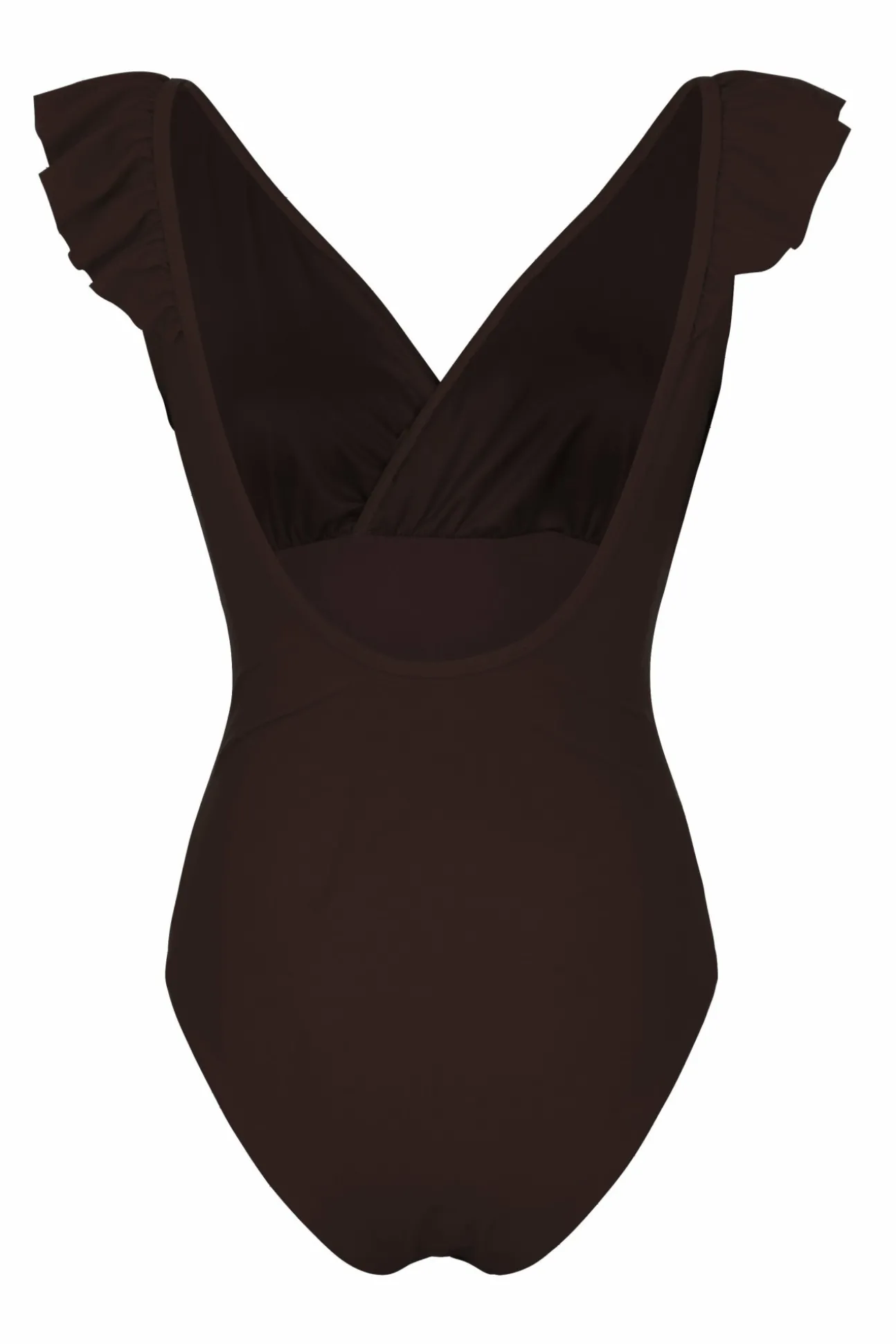 Flatterende Badedragt Med Wrap-Effekt Og Flæsedetaljer I Cool Print Eller Ensfarvet. Fremstillet Af 82% Genanvendt Polyamid Og 18% Elastan.