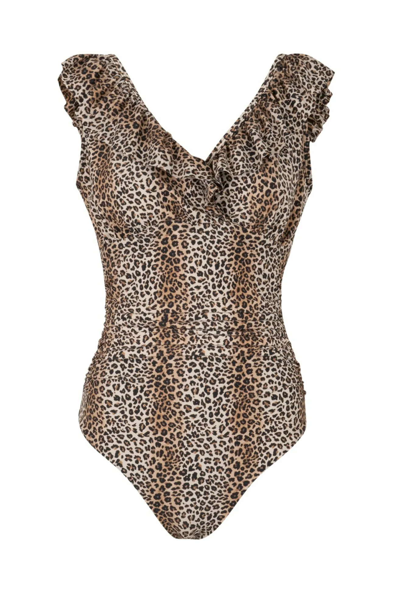 Flatterende Badedragt Med Wrap-Effekt Og Flæsedetaljer I Cool Print Eller Ensfarvet. Fremstillet Af 82% Genanvendt Polyamid Og 18% Elastan.