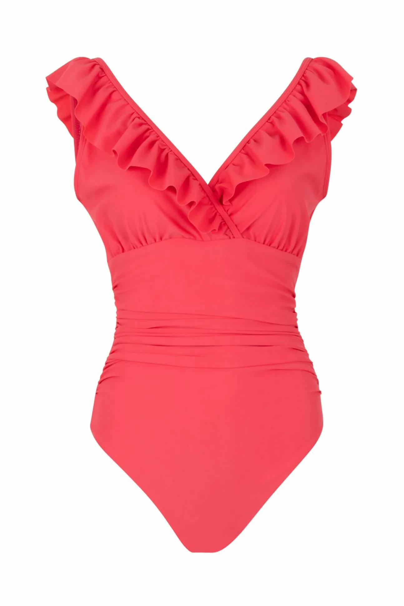 Flatterende Badedragt Med Wrap-Effekt Og Flæsedetaljer I Cool Print Eller Ensfarvet. Fremstillet Af 82% Genanvendt Polyamid Og 18% Elastan.