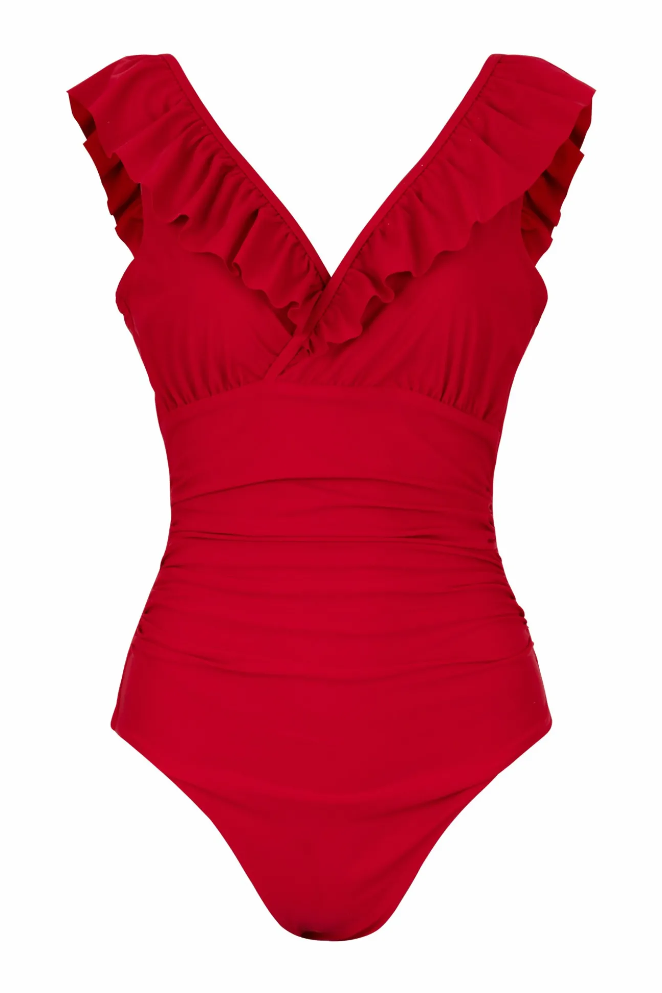 Flatterende Badedragt Med Wrap-Effekt Og Flæsedetaljer I Cool Print Eller Ensfarvet. Fremstillet Af 82% Genanvendt Polyamid Og 18% Elastan.