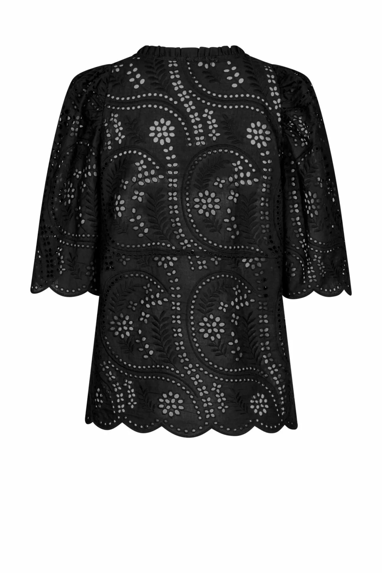 Løstsiddende Bluse Fremstillet I Et Fint Broderie Anglaise Materiale Med En Elegant Binde-Detalje Foran. Charmerende Flæser Omgiver En Flatterende V-Udskæring, Der Udstråler En Tidløs Femininitet. Lavet I 100% Økologisk Bomuld.
