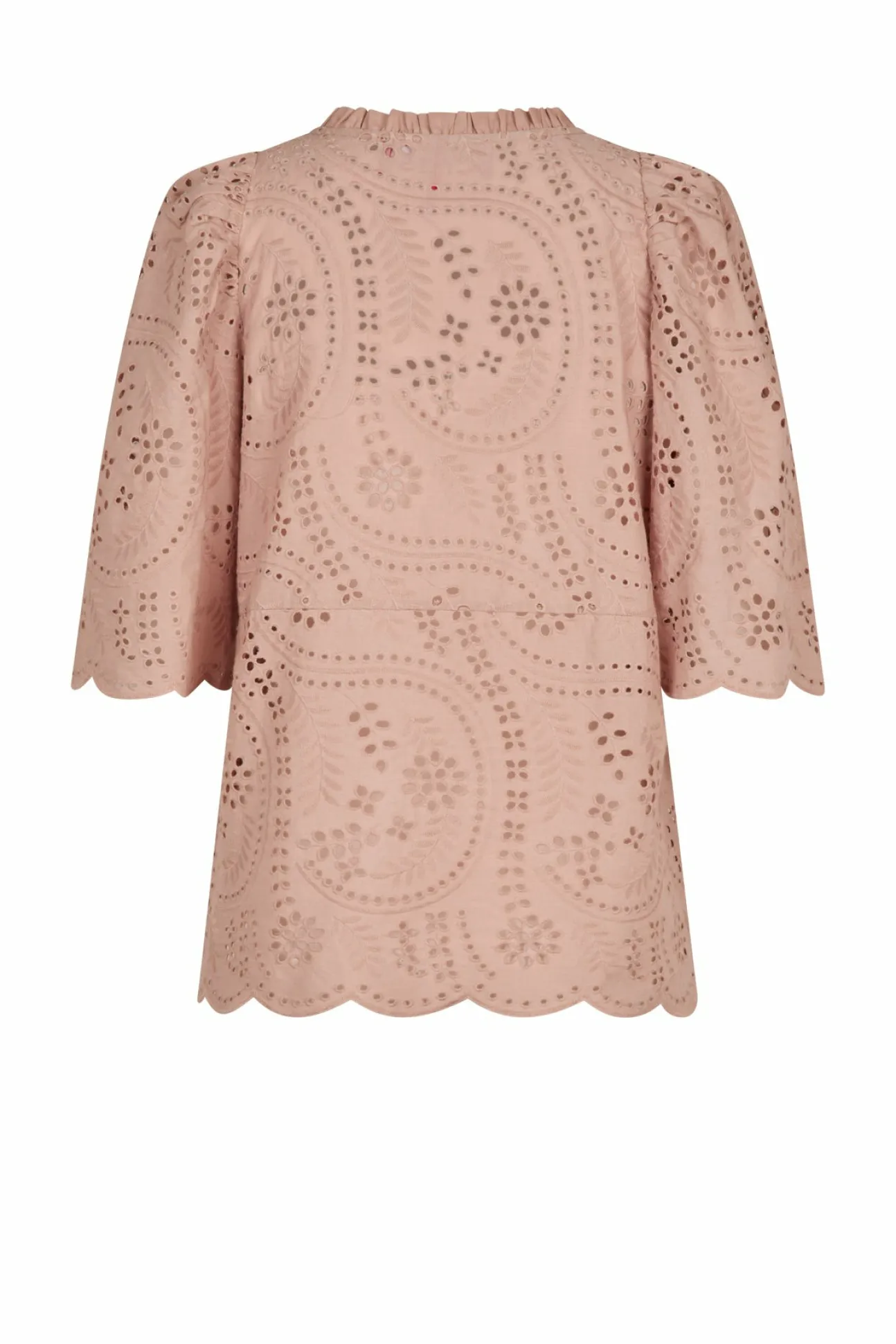 Løstsiddende Bluse Fremstillet I Et Fint Broderie Anglaise Materiale Med En Elegant Binde-Detalje Foran. Charmerende Flæser Omgiver En Flatterende V-Udskæring, Der Udstråler En Tidløs Femininitet. Lavet I 100% Økologisk Bomuld.