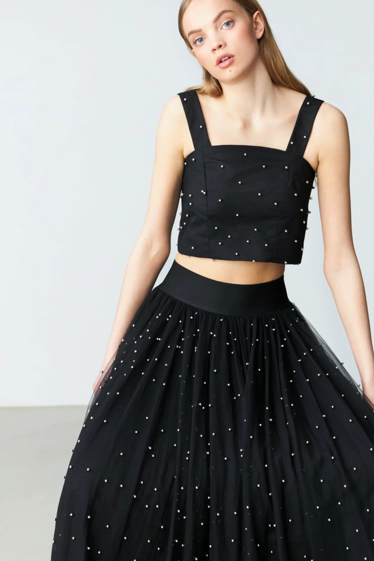 Formsyet Top Med Brede Stropper Og Cool Rå Lynlåslukning Bagpå. Pyntet Med Masser Af Perler. Match Med Pam Nederdel. Fremstillet Af 100% Genbrugsnylon.