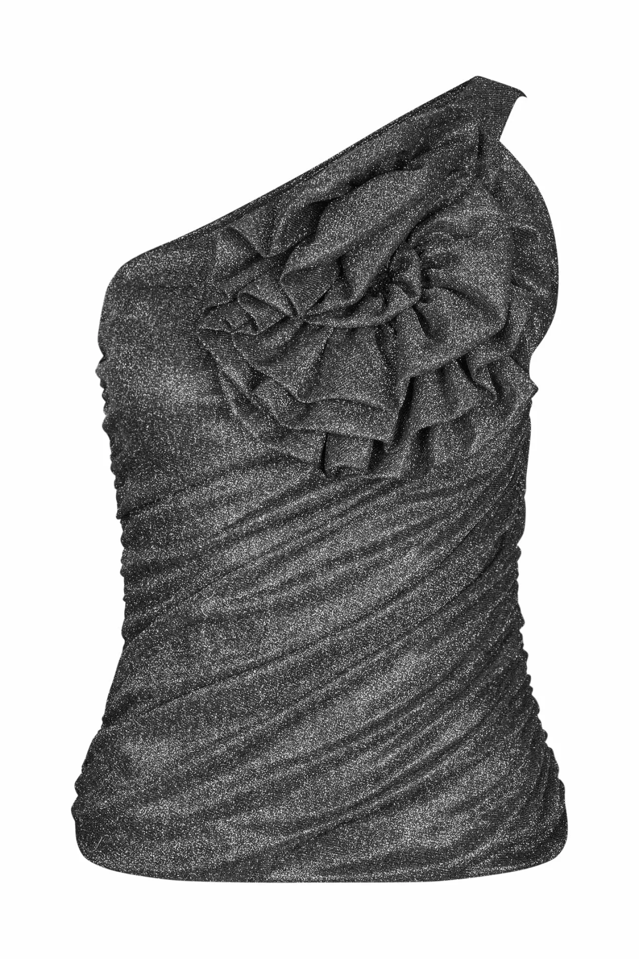 Blød, One-Shoulder Jersey Top Med Oversized Blomst. Fremstillet Af 52% Genanvendt Polyester Og 48% Metallisk Polyester.
