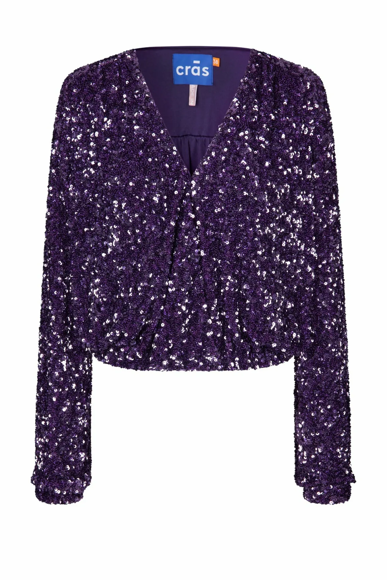 Glimtende Langærmet Top Med V-Udskæring, Slå-Om Effekt, Elastik I Ærmeåbningerne Og Taljen. Blusen Draperer Smukt På Grund Af Masser Af Rynk Både Foran Og Bagpå. Fremstillet Af 100% Genanvendt Polyester Fra Plastaffald.