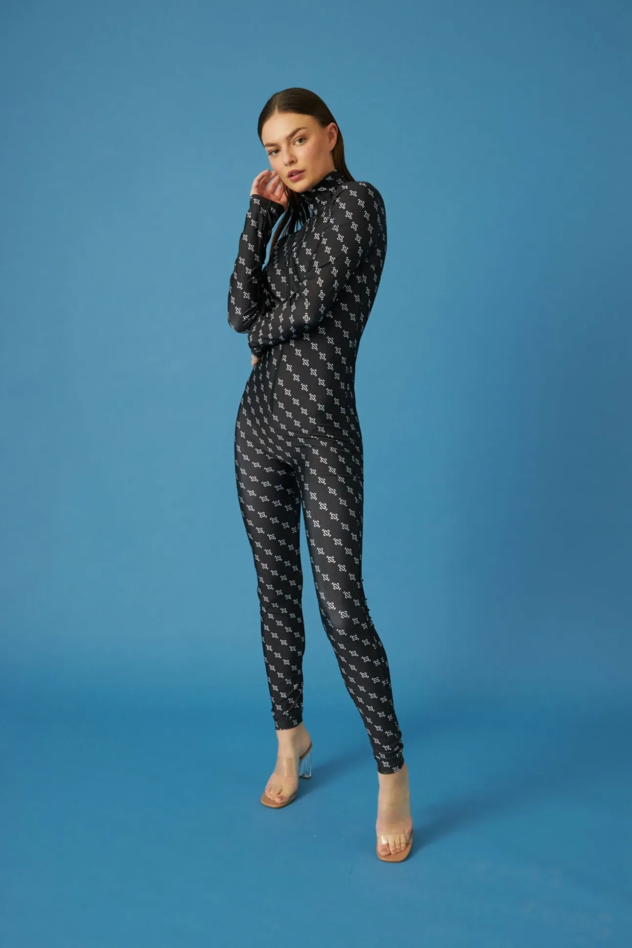 Sexet, Slim Fit Jumpsuit Med Høj Hals Og Lynlås Foran. Fremstillet Af 88% Genanvendt Polyester Og 12% Elastan.