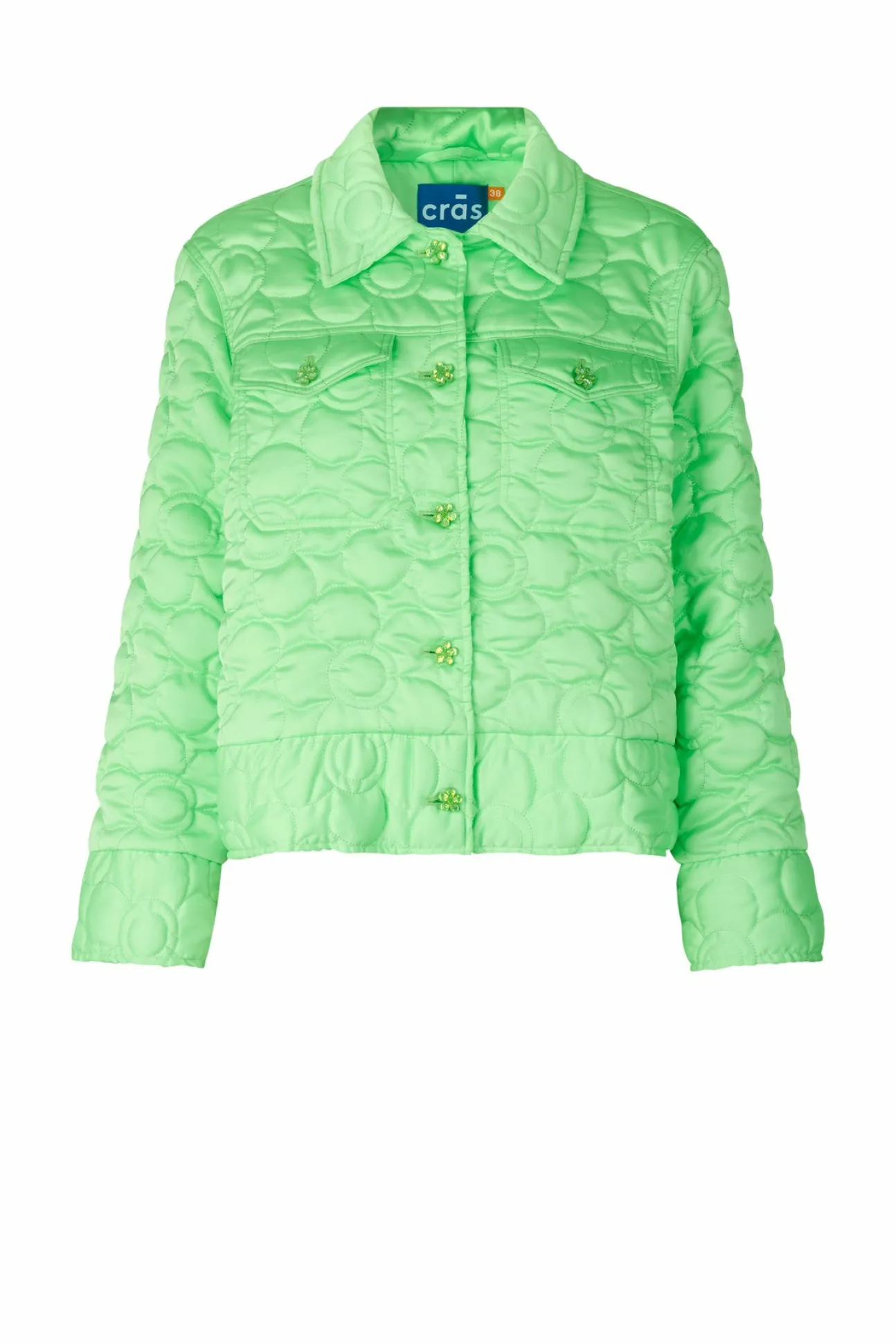 Kort Jakke Quiltet I Et Cool Blomstermønster. Jakken Harblomsterformede Knapper, To Brystlommer Og Skrålommer I Siden….