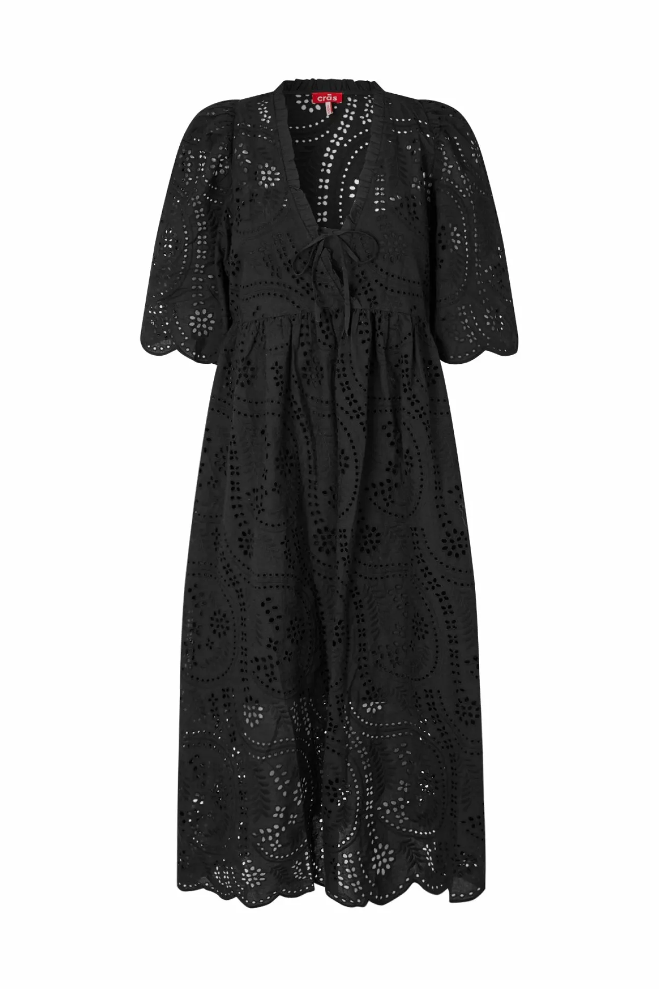 Løstsiddende Kjole Fremstillet I Et Fint Broderie Anglaise Materiale. Pyntet Med Charmerende Flæser, Der Omgiver En Flatterende V-Udskæring, Udstråler Denne Kjole Tidløs Kvindelighed. Komplet Med Matchende Foring Og En Elegant Binde-Detalje Foran. Lavet I 100% Økologisk Bomuld.