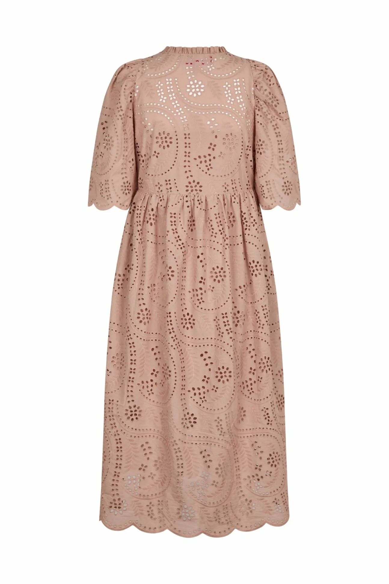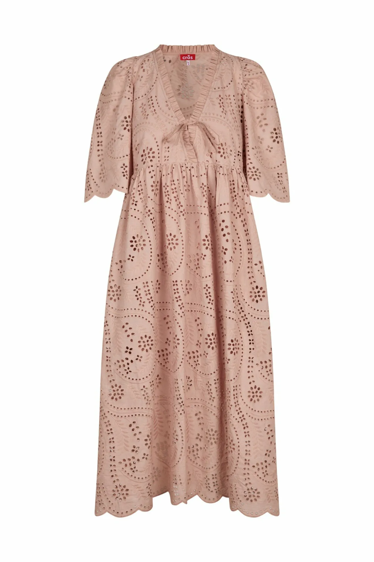 Løstsiddende Kjole Fremstillet I Et Fint Broderie Anglaise Materiale. Pyntet Med Charmerende Flæser, Der Omgiver En Flatterende V-Udskæring, Udstråler Denne Kjole Tidløs Kvindelighed. Komplet Med Matchende Foring Og En Elegant Binde-Detalje Foran. Lavet I 100% Økologisk Bomuld.