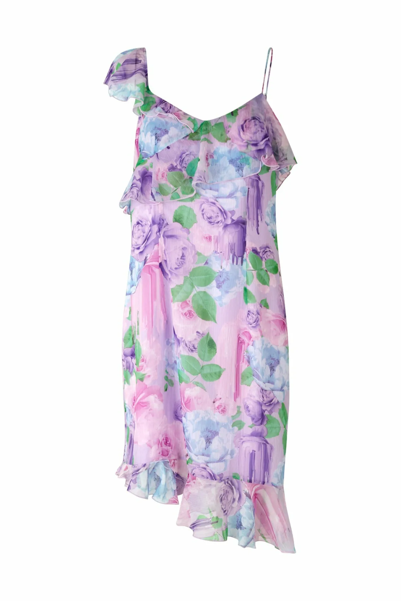 Asymmetrisk Kjole Med Én Strop Og Ét Kort Ærme. Pyntet Med Flæser På Både Top Og Bund. Fremstillet Af 100% Genanvendt Polyester.