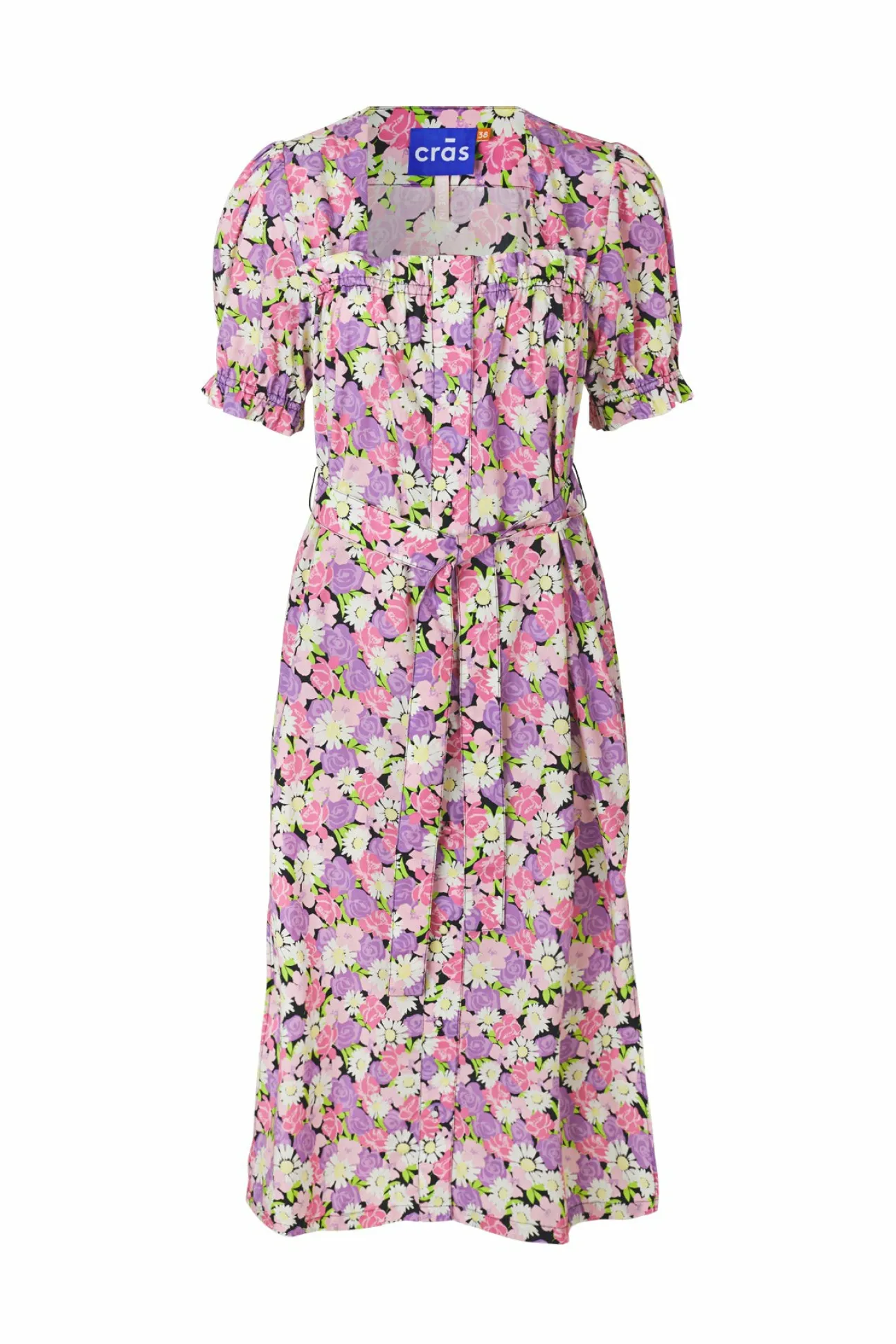 Romantisk Sommerkjole Med Aftageligt Bælte I Taljen, Firkantet Hals Og Puff-Ærmer Med Flæsedetaljer. Lavet Af 100% Organisk Bomuld.
