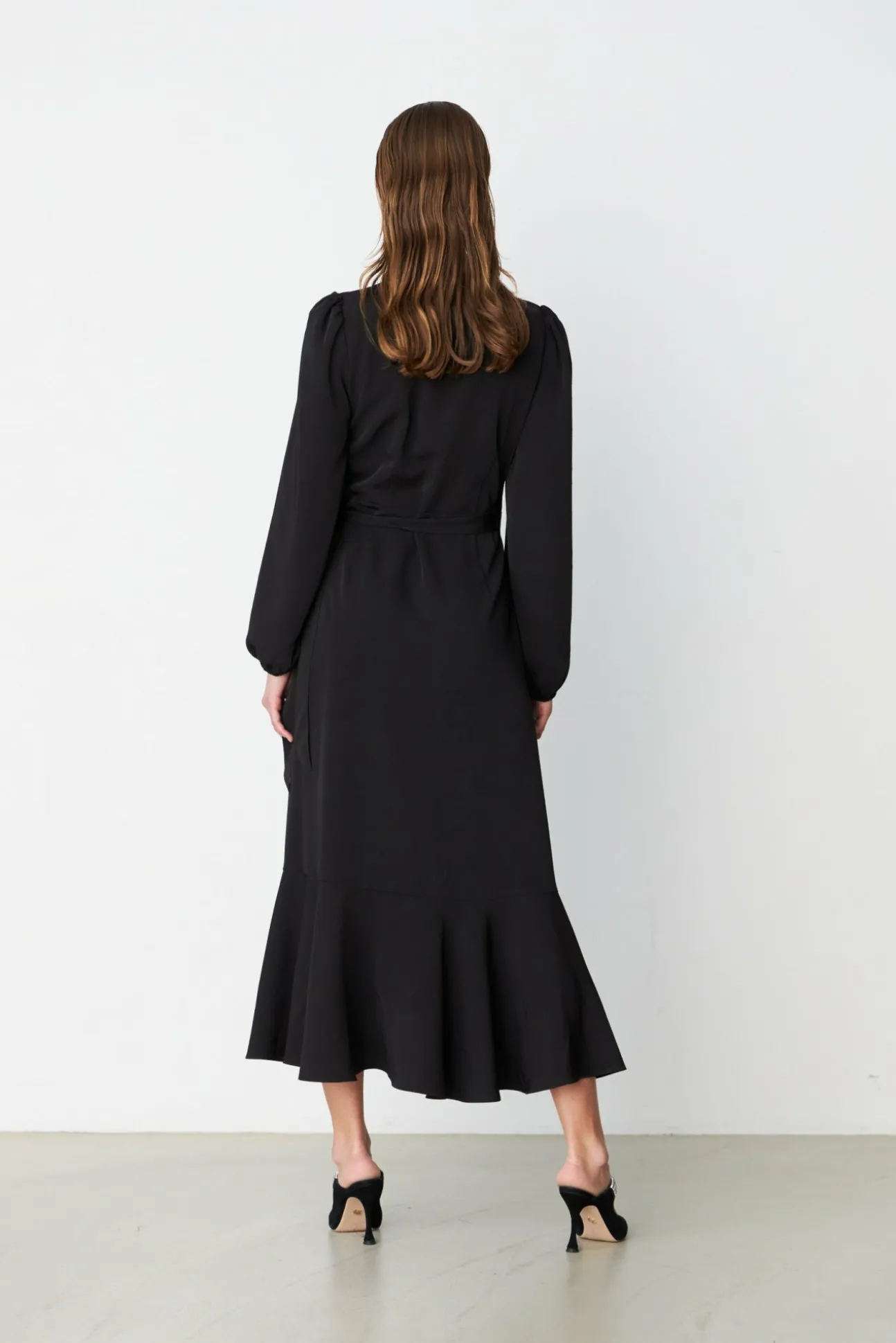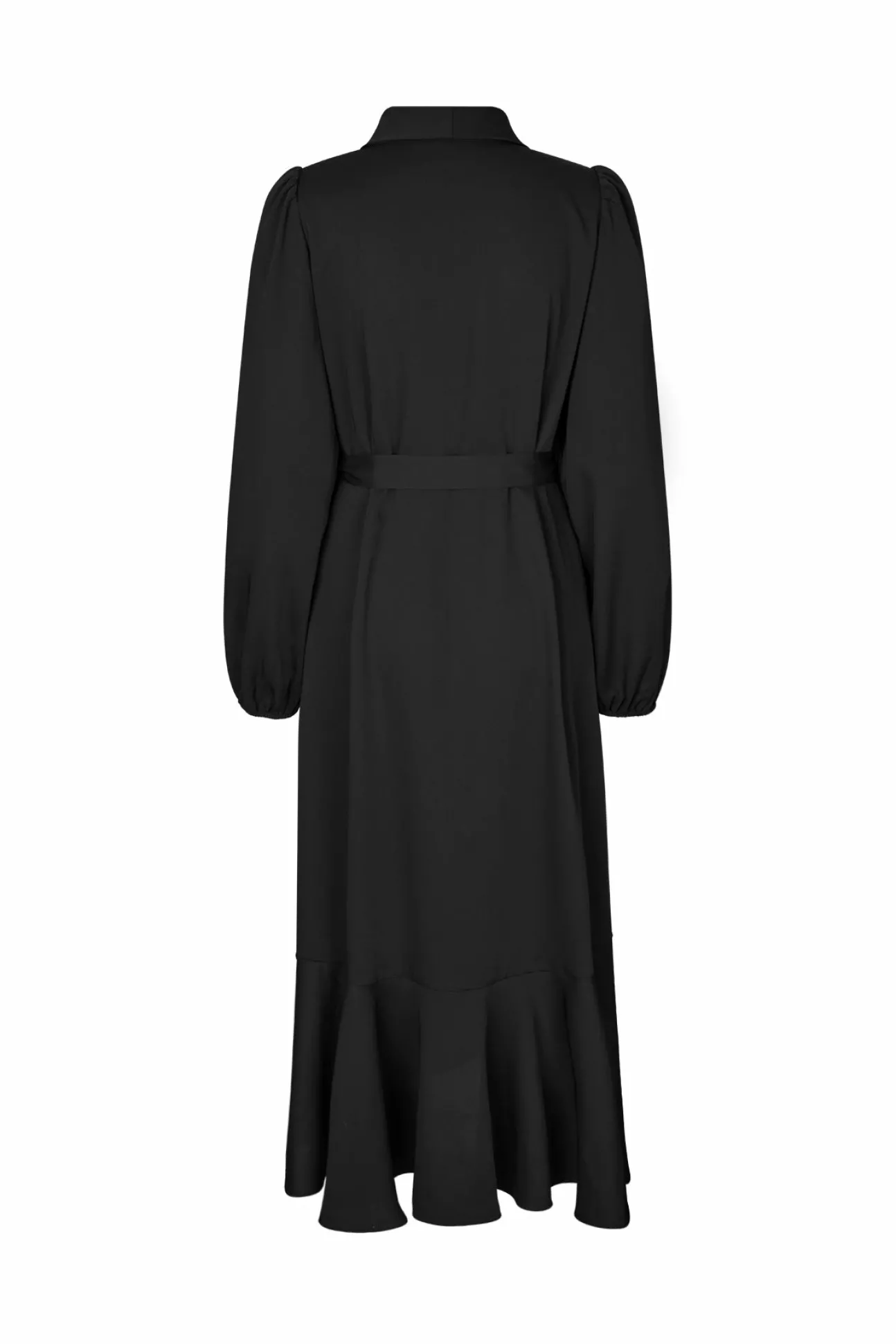 Lang “Flowy” Slå-Om-Kjole Med Flæsedetaljer, Lange Ballonærmer Og Aftagelig Blomsterdekoration Ved Bæltet. Fremstillet Af 97% Genanvendt Polyester Og 3% Elastan.