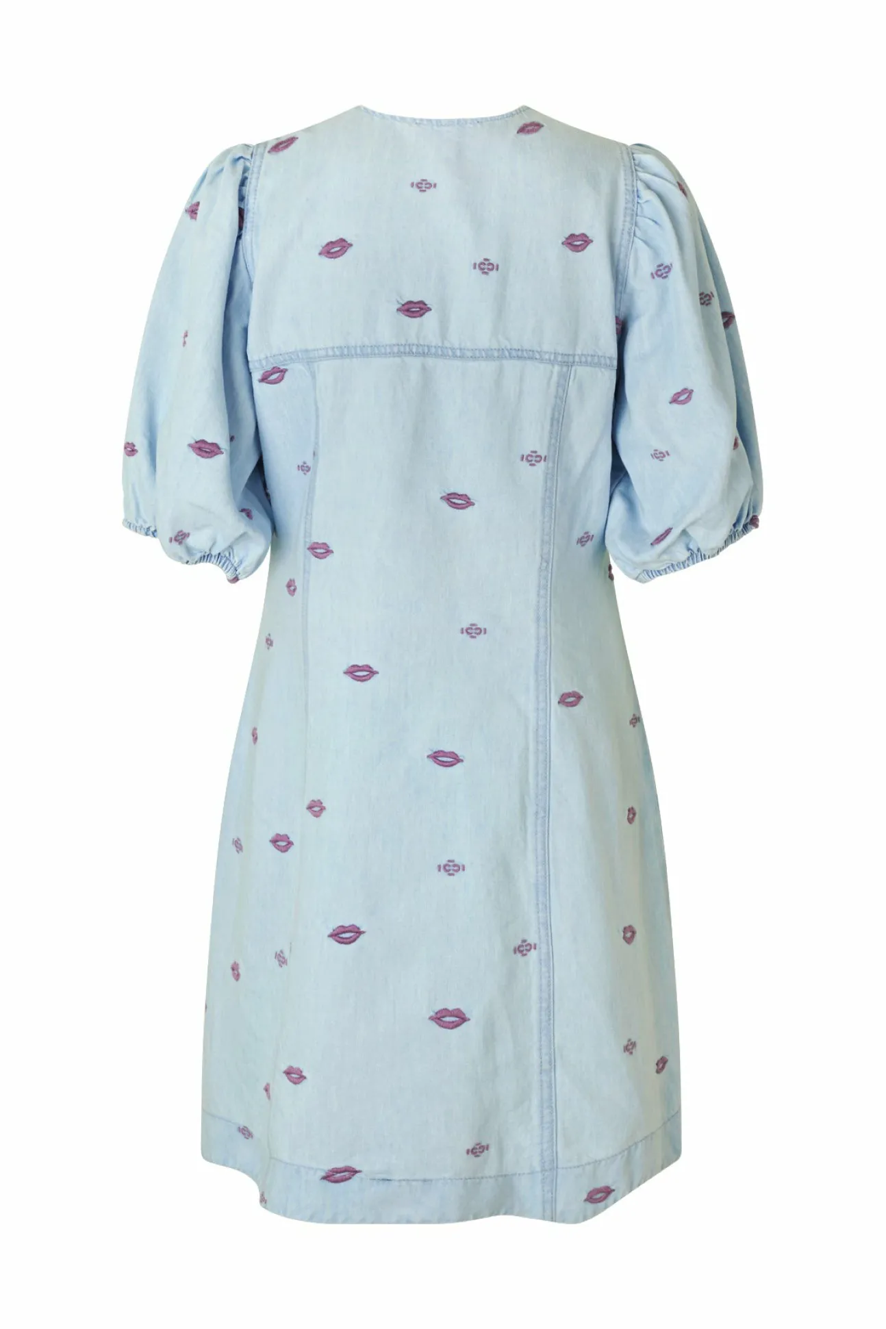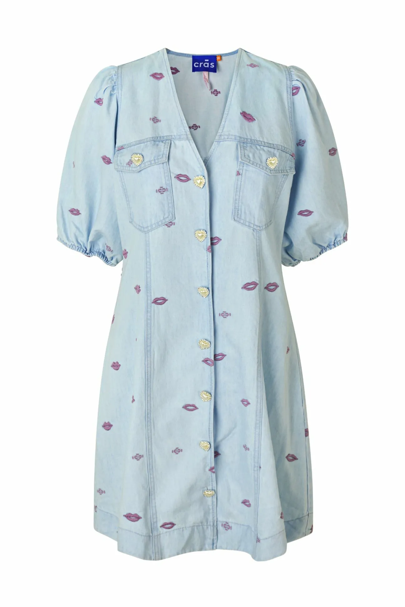 Cool Denimkjole Med Fint Broderi I Form Af Logo Og Læber. Dekoreret Med Hjerteknapper På Brystlommer, Samt Ned Foran På Kjolen.