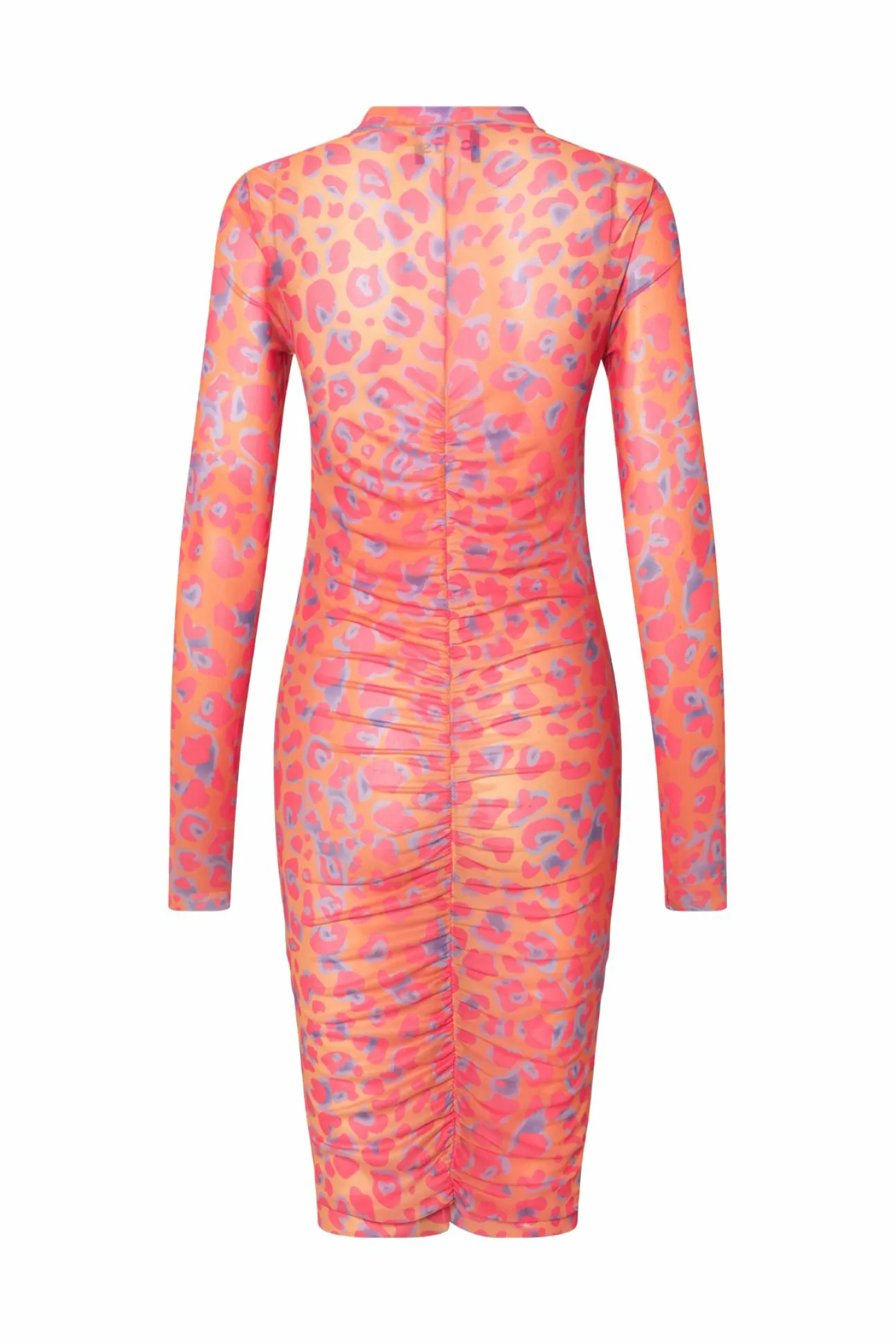 Tætsiddende Kjole I Forskellige Fede Prints Med Lille Halsudskæring Og Draperinger Forneden. Fremstillet Af 92% Genanv…