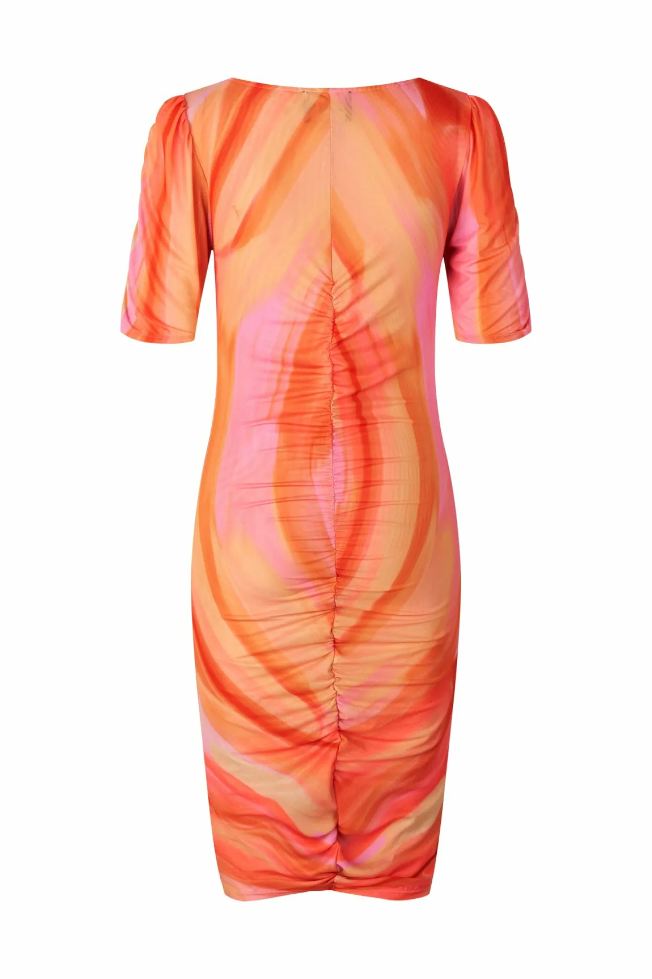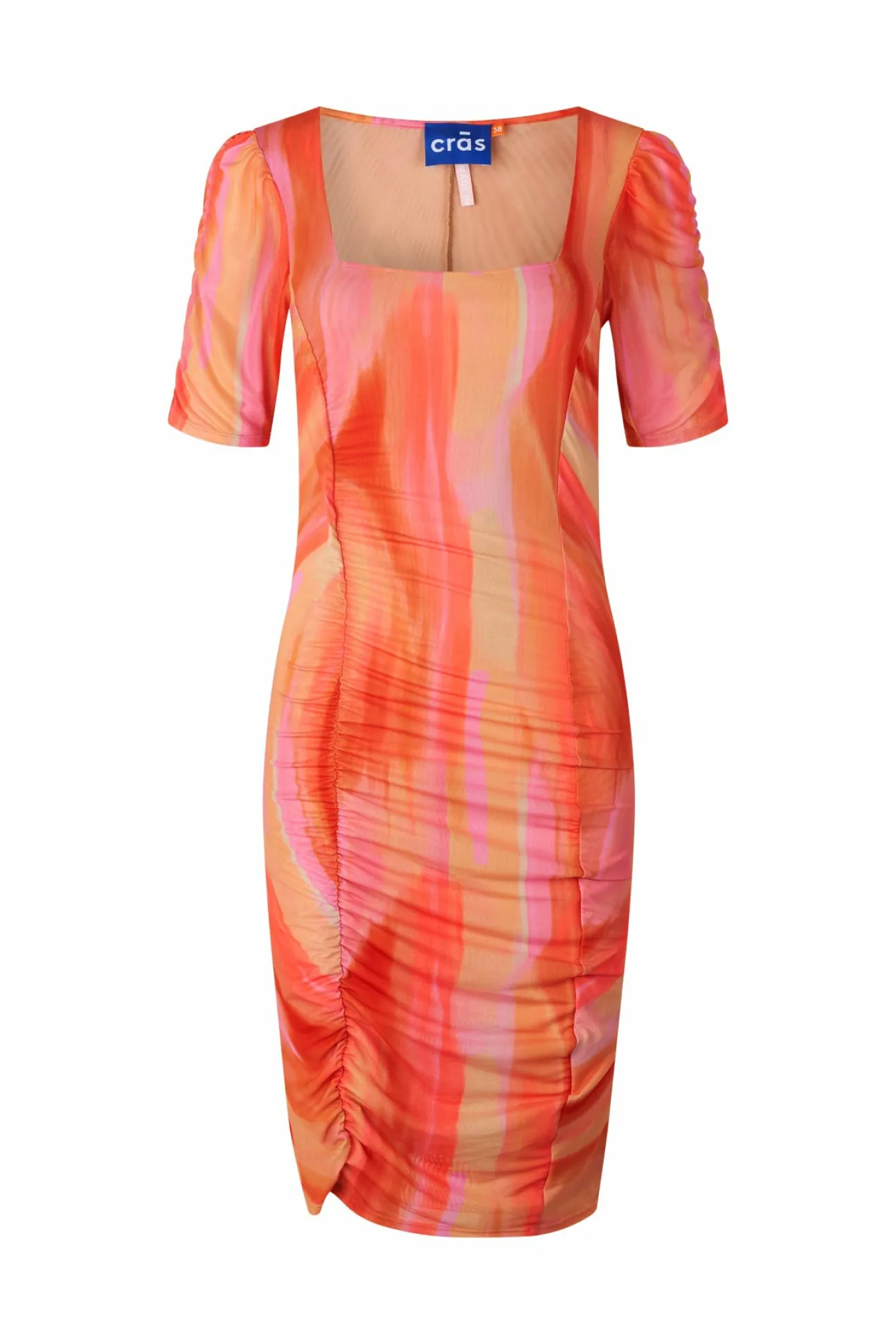 Slim Fit Kjole I Cool Print Med Firkantet Halsudskæring, 3/4 Pufærmer Og Rynk Ned Langs Fronten For Et Flatterende Look. Fremstillet Af 92% Genanvendt Polyester Fra Plastaffald Og 8% Elastan.