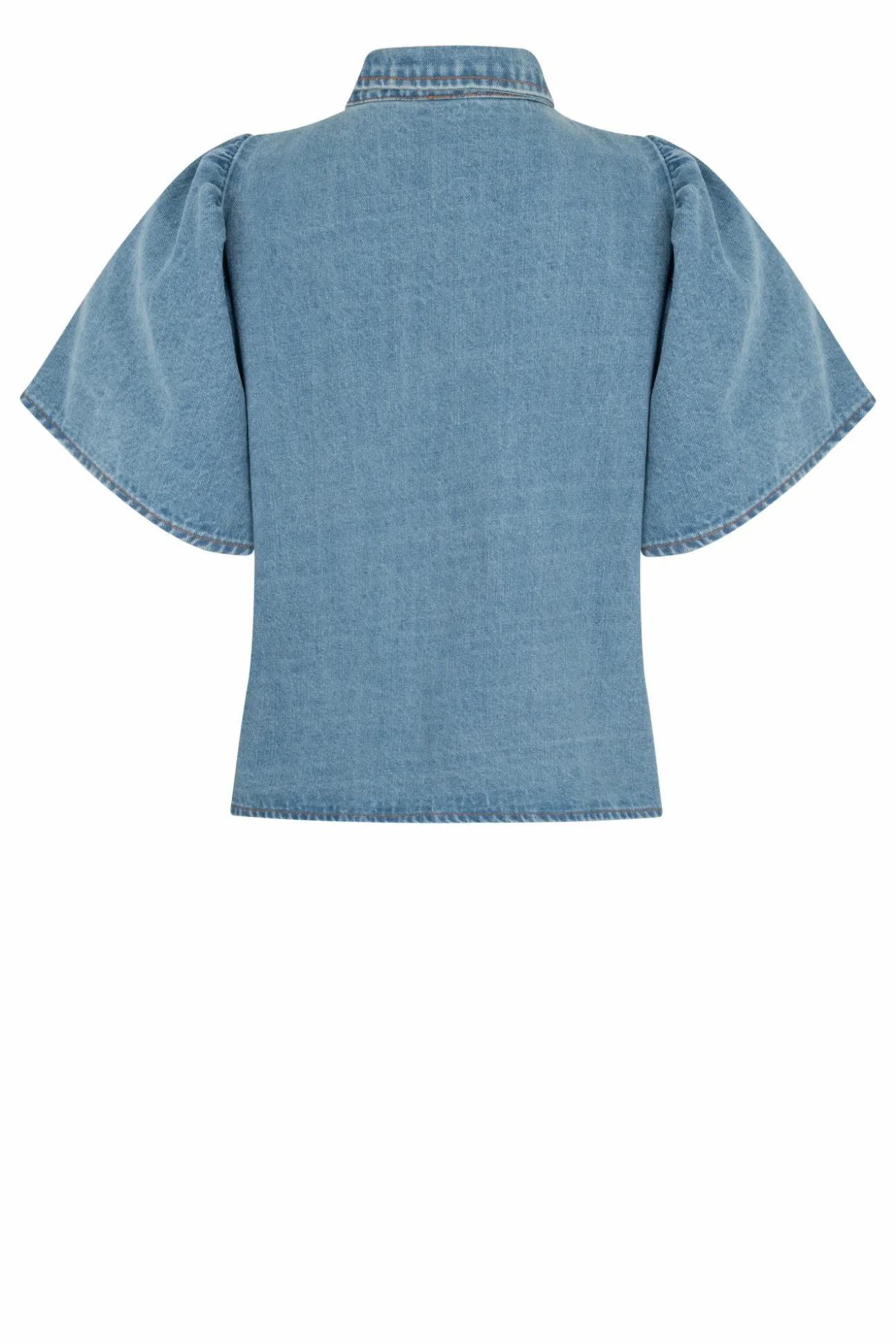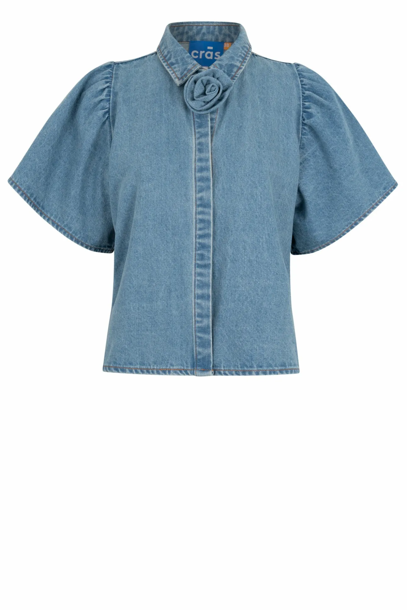 Cool Denimskjorte Med Voluminøse Pufærmer, Skjulte Knapper Ned Langs Fronten Og Aftagelig, Dekorativ Rose.
