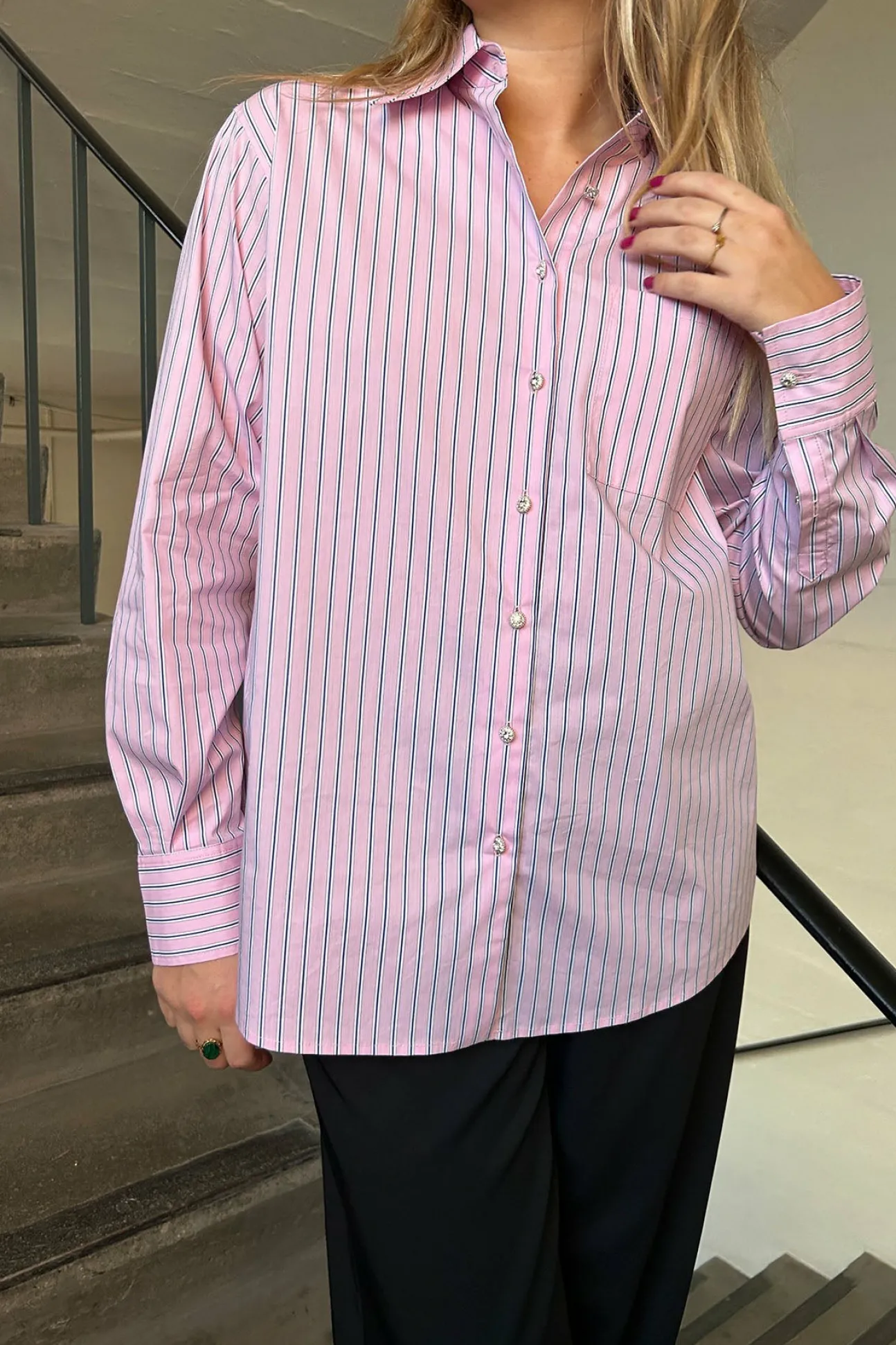 Cool, Stribet Skjorte Med Rhinstensknapper Og Brystlomme. Den Lettere Overdimensionerede Pasform Tilføjer En Moderne Kant, Hvilket Sikrer Både Komfort Og Alsidighed. Style Den Sammen Med Dine Yndlingsjeans For Et Afslappet Look, Eller Dress Den Op Med Skræddersyede Bukser For Et Mere Raffineret Og Poleret Look. Fremstillet Af 65% Polyester Og 35% Viskose.