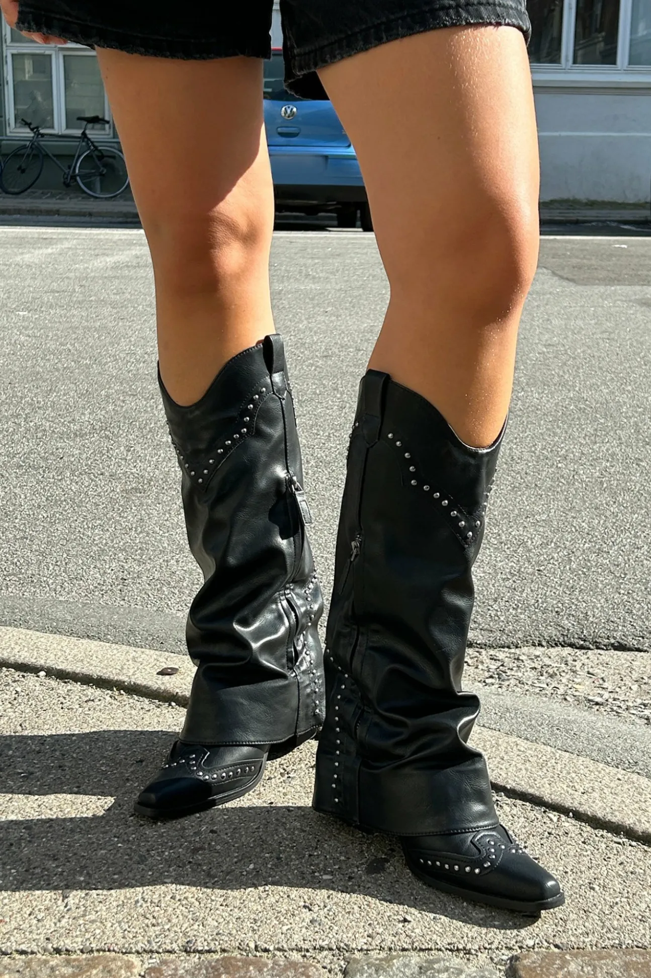 Lange, Super Fede Cowgirl-Støvler I Læderlook Med Metalnitter. Fremstillet Af 100% Polyurethan.